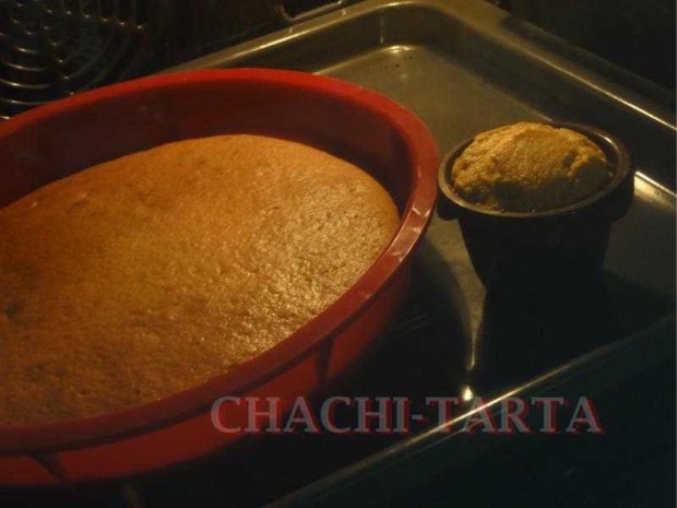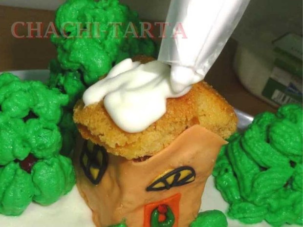 La casita también está hecha de bizcocho, con lo cual he horneado un poquito de la misma mezcla en un molde para magdalenas que posteriormente recorté para darle la forma.