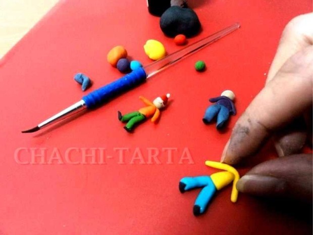 Para decorar he utilizado nata montada y algunas figurillas hechas con fondant de azúcar, he hecho unos hombrecitos minúsculos sin mucho detalle. Si tienes sobrantes de fondant de diversos colores es un buen momento para reutilizarlos, siempre que te sobren guárdalos envueltos en film que luego sirven. Yo no tenía ni un pedacito, he tenido que pintarlos sobre la marcha y mancharme mucho los dedos