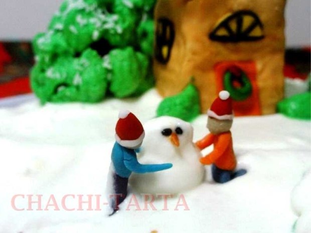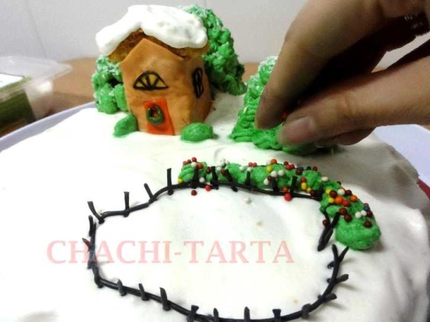 He rematado la decoración espolvoreando mostacillas de colores en los árboles y colocando los muñequinos de modo tal que parece que construyen un minúsculo hombre de nieve hecho también con nata montada.