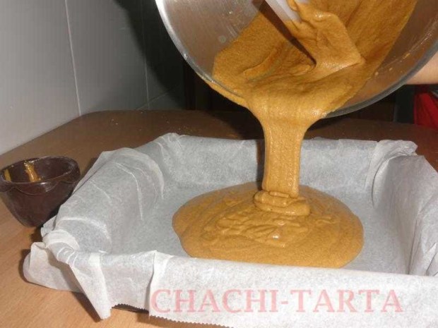 Vuelca la mezcla en el molde, yo he usado uno cuadrado de aluminio forrado con papel vegetal con dimensiones de 21×21; poner papel vegetal es más práctico que engrasar el molde, así te aseguras que el bizcocho no se rompa al desmoldar. También reservé un poquito de masa para rellenar un molde de magdalena que servirá para la cabeza.
