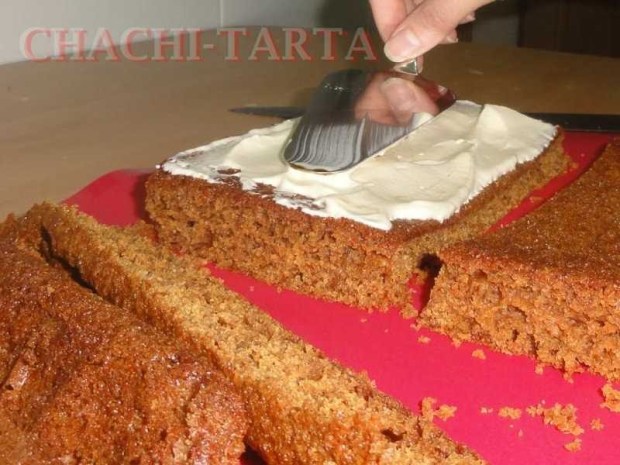 El bizcocho es de sabor caramelo, decorado con nata montada con sabor a caramelo, he sacado la receta del libro «Clandestine Cake Club», que fue un regalo de cumpleaños que me hizo mi suegro, que bien me conoce!! 🙄