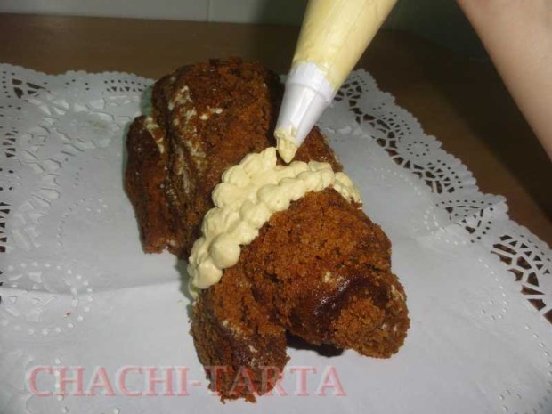 Posteriormente redondea los laterales con ayuda de un cuchillo muy afilado e incrusta la magdalena en lo que será la cabeza. coloca los sobrantes de los laterales a modo de simular las patas y la cola.