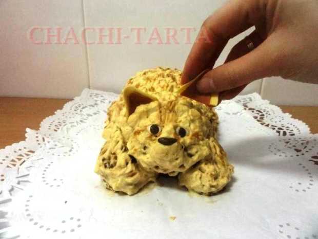 Para darle un poco de realismo y que no quedase de un único color he puesto rayitas de caramelo líquido en la cara y cuerpo cuidadosamente con ayuda de un pincel; para los ojos, nariz y orejas he utilizado fondant de azúcar (Dr Oetker – sin gluten).