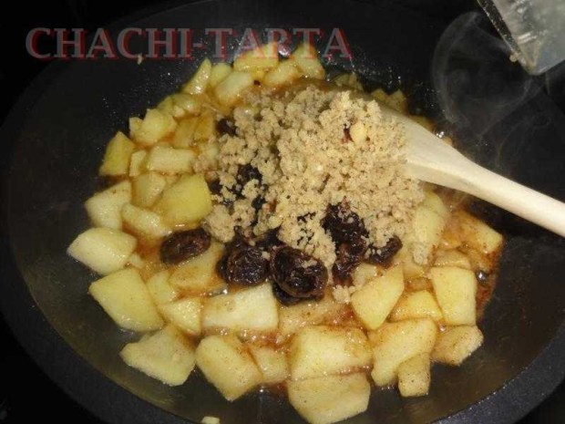 Has de empezar con el relleno, para ello lava, pela y corta las manzanas en trozos no muy chicos ni muy grandes. Ponlas a cocinar en una sartén con mantequilla, azúcar, canela y uvas pasas previamente hidratadas. Finalmente añade las nueces molidas y la copita de ron (esto es opcional).