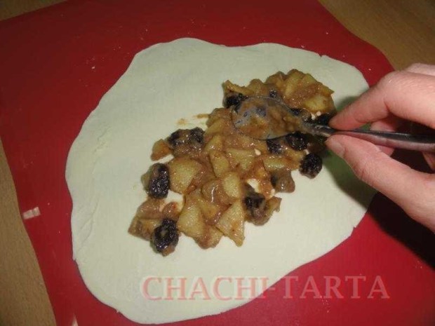 Cuando la manzana haya cogido color retira del fuego y deja enfriar a temperatura ambiente. Mientras tanto extiende la masa de hojaldre (yo he usado recortes de masa de hojaldre sin gluten de ADPAN) sobre una hoja de papel vegetal o alfombrilla de silicona y con ayuda de un rodillo estírala de modo que quede más fina y coloca la manzana por encima, unta los bordes con huevo batido y dobla para sellar.