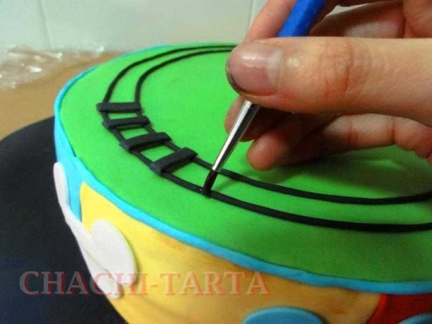 Los vagones del trencito también están hechos de bizcocho, por lo que he horneado 2 bizcochos grandes y 1 pequeño del cual he sacado recortes que posteriormente he cubierto con fondant de diversos colores.