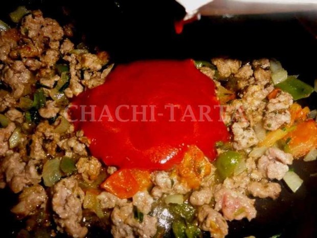 Saltea el tomate, el pimiento y la cebolla en una sartén con mantequilla hasta que se pongan tiernos, agrega la carne molida (puede ser de ternera o mezcla de cerdo) salpimentada, añade orégano, cilantro y cebollino picados muy finos.