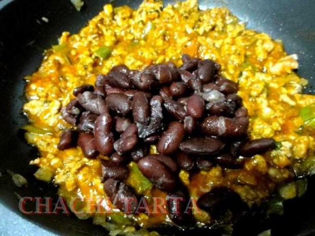 Finalmente agrega los frijoles (alubias rojas o moradas) y continúa cocinando unos minutos más. En este caso he cocido yo en casa, puedes utilizar de lata pero si eres celíaco ten en cuenta revisar etiquetas.