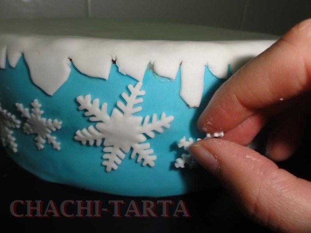 Posteriormente he cubierto la superficie de la tarta con fondant blanco que he recortado a modo de simular que cae por los bordes en plan «efecto nieve» y he colocado la decoración justo en el centro.