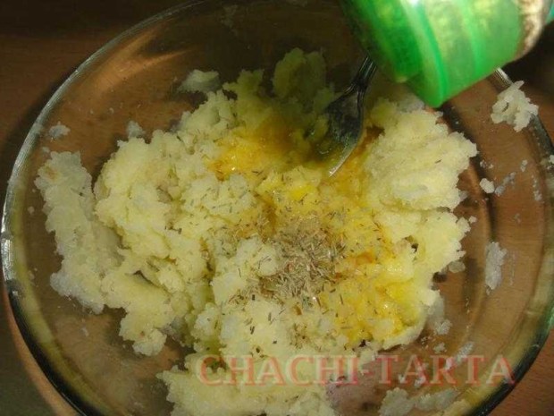 Pon a cocer las patatas en abundante agua con sal, cuando estén blandas retira, pela y tritura en pasapurés o simplemente aplastando con un tenedor. Agrega el huevo batido, la mantequilla derretida, las hiervas frescas, la maizena y mezcla hasta que todo esté totalmente integrado.