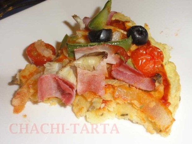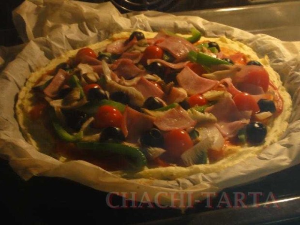 Unta la superficie de la masa con salsa de tomate, en este caso he usado tomate frito de la marca SOLIS (sin gluten) y si lo prefieres puedes poner queso rallado, incorpora el resto de ingredientes incluyendo el jamón o peperoni cortado en tiritas, escurre un poco de aceite de oliva por encima y vuelve a hornear durante otros 20 minutos.