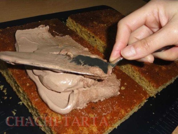 He horneado un único bizcocho en un molde rectangular de 27×24, para hacer el maletín recorta los bordes y luego en mitades iguales, rellena con abundante nata y apila los bizcochos y cubre ligeramente toda la superficie.
