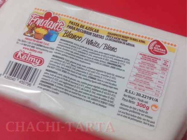 Para decorar he utilizado fondant de azúcar, pero esta vez he utilizado de la marca KELMY, es otro de mis más recientes descubrimientos; lo encontré en una tienda de productos de pastelería y me llamó la atención ver que ponía etiqueta sin gluten.