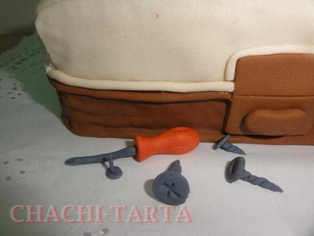 Para hacerlo más realista he hecho unos tornillos de fondant que he colocado por fuera de la tarta y que a mi suegro le han causado mucha gracia 😛