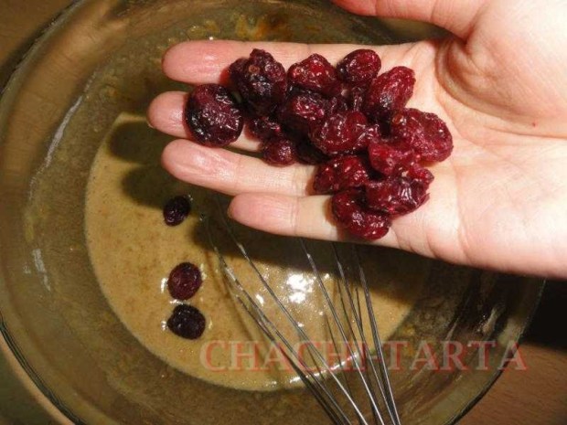 Incorpora poco a poco la mezcla de harina de arroz y levadura, en este caso la levadura que utilicé es de la marca HACENDADO, si no tienes puedes poner también un poco de bicarbonato sódico; una vez incorporada añade un puñado de arándanos pasos y mezcla nuevamente para distribuirlos uniformemente en la masa.