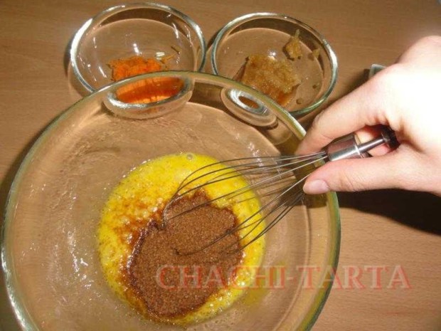 Bate los huevos junto con el azúcar moreno hasta que ésta se disuelva y se forme una mezcla espumosa, añade la manzana y zanahoria ralladas muy finamente y mezcla. Dependiendo del dulzor de la manzana puedes añadir menos cantidad de azúcar o puedes utilizar edulcorante si te apetece.