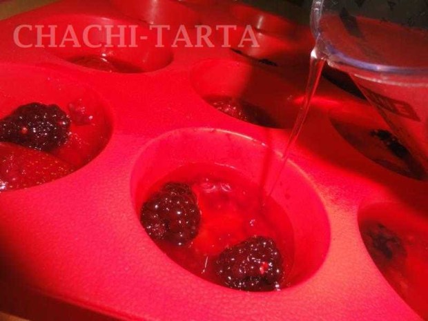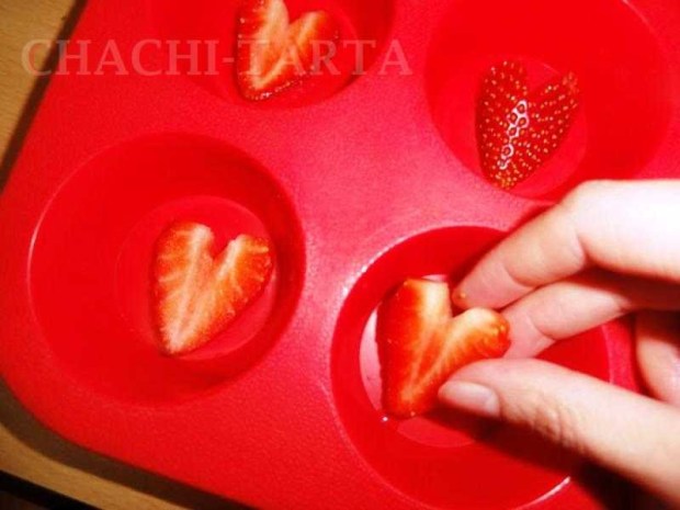 Lava y quita las hojas a las fresas, parte por mitades y haz un corte de manera que simule un corazón, coloca media fresa en el fondo de cada molde (yo usé moldes de silicona para magdalenas) junto con algunas moras, frambuesas y arándanos y vierte gelatina a la mitad del molde. Conserva en la nevera unos 15 minutos para que cuaje y rellena los moldes con el resto de la gelatina.