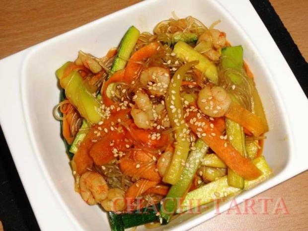Fideos chinos con gambas y verdura (sin gluten)