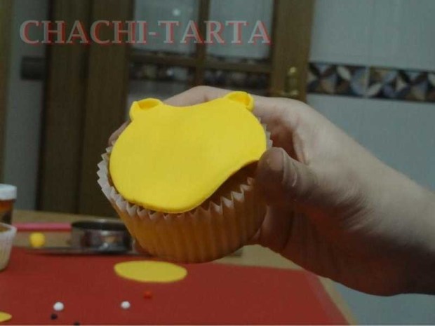 Con ayuda de un rodillo extiende el fondant amarillo y recorta círculos del mismo tamaño que el cupcake que pegarás en la superficie humedeciendo ligeramente con agua, habiendo colocado previamente las piezas que formarán las orejas.