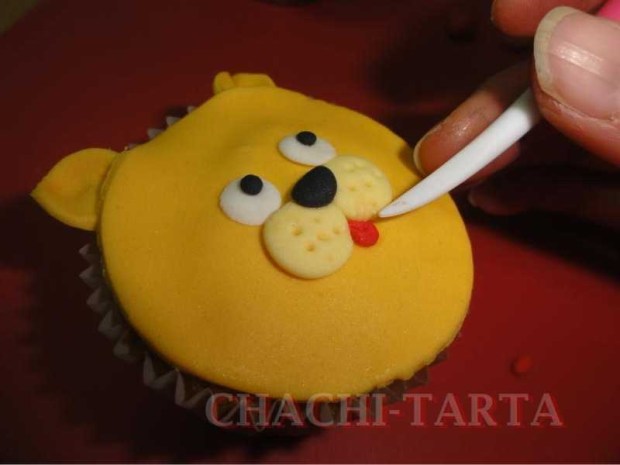 Para cada cupcake junta dos bolitas amarillas para hacer el morro, una negra y una roja que simularán la nariz y la boca, coloca los ojos y pega todas las piezas en la posición correspondiente.