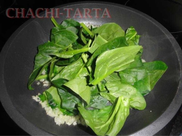 Empieza por el relleno, para ello saltea el ajo o cebolla en aceite caliente, yo puse cebolla porque no soy muy amiga del ajo (no me gusta) y cuando esté tierna añade las hojas de espinaca con un pelín de sal. Cocina hasta que se hayan reducido completamente, durante unos 5 minutos más o menos, una vez hechas retira y deja templar.