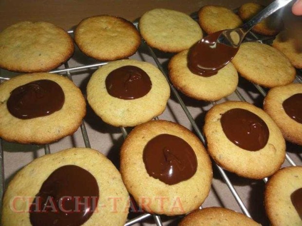 Con una cucharilla escurre por el centro de cada galleta, sin llegar a los bordes, e inmediatamente espolvorea con pistachos triturados para darle un poco de color. Que guapas quedan y además buenísimas!!… muy recomendables.