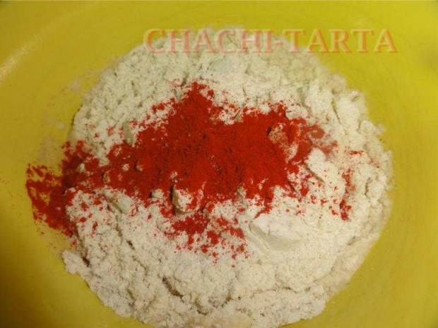 Añade a la masa una pizca de sal y una cucharadita de colorante alimenticio, en El Salvador se suele usar «achiote«, es una especia que además de sabor y aroma aporta un color maravilloso, cada vez que viajo a mi país traigo conmigo varias bolsitas ya que aquí es difícil conseguirlo.