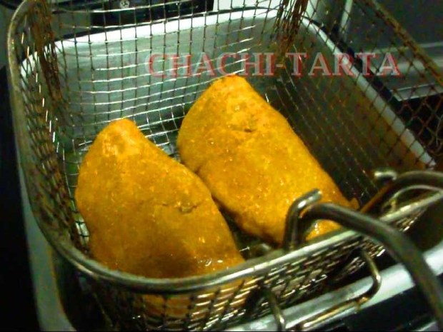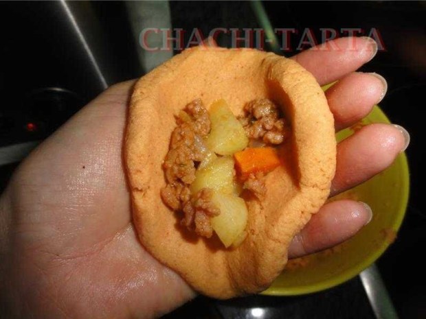Mientras va calentando el aceite forma los pastelitos, forma bolitas de la masa del tamaño que desees, una a una aplasta las bolitas de modo tal que formes una tortita fina, yo lo hago con las palmas de las manos. Coloca una cucharadita de la carne picada por el centro, dobla y sella los bordes para que el relleno no se salga mientras se fríen.