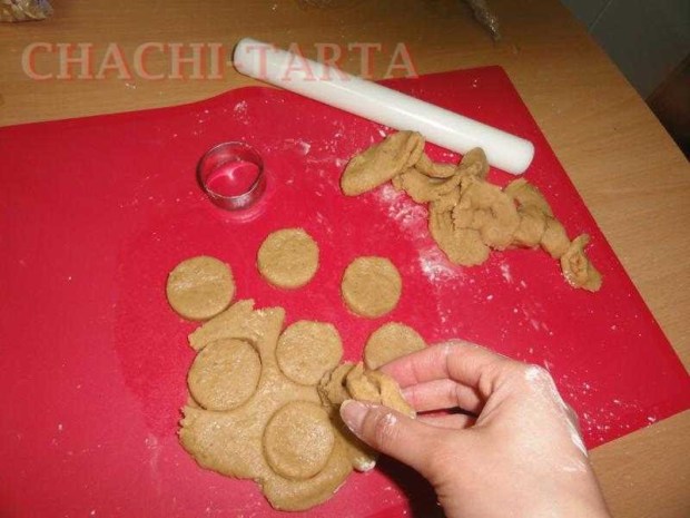 Transcurrido el tiempo de enfriado, extiende la masa con ayuda de un rodillo hasta que alcance un grosor de 1cm, hazlo preferentemente sobre una hoja de papel vegetal o alfombrilla de silicona, si notas que la masa está pingosa puedes espolvorear un poquito más de harina. Con un cortador de pastas con forma circular, recorta las galletitas dejando un poco de separación entre si y retira los bordes sobrantes; las que yo hice son pequeñas más o menos de unos 5cm de diámetro.