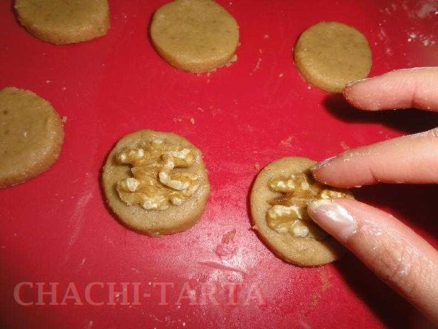 Coloca en cada galletita la mitad de una nuez y presiona ligeramente con los dedos para que quede muy bien incrustada; hornéalas a 200 grados durante 10 a 15 minutos (horno precalentado) hasta que notes que se han vuelto muy doraditas.