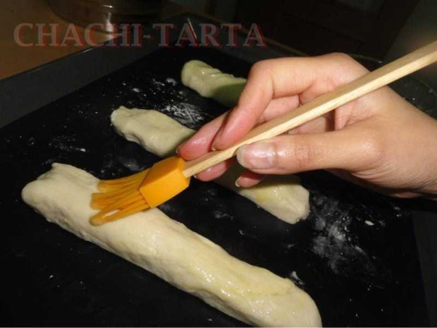 En una mesa o superficie bien enharinada, coloca unas 2 cucharadas de la masa y moldea los panecillos, verás como está muy pingosa así que es mejor que te untes bien las manos con un poco de agua o aceite para que puedas manipularlos bien. Colócalos en la bandeja del horno dejando al menos unos 5 centímetros de separación.