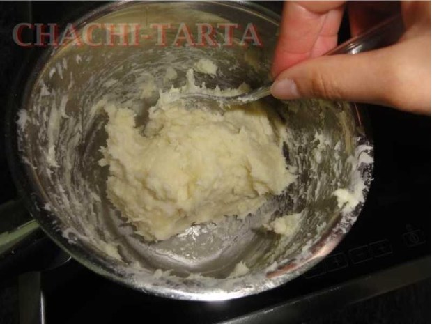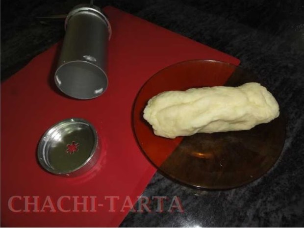 Verás como poco a poco va endureciendo y parece que cuesta remover, continúa haciéndolo hasta que la masa deje de humear; retira de la olla y deja reposar unos 15 minutos a temperatura ambiente. Amasa con las manos de forma tal que formes un rollo alargado e introduce en la churrera.