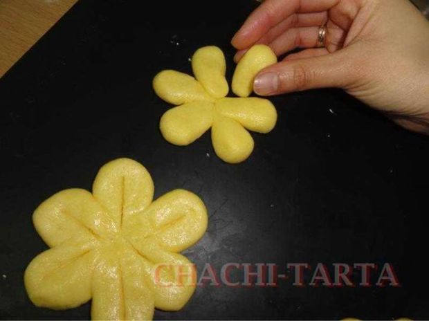 Coloca las galletas en la bandeja de horno dejando separación entre sí ya que con el horneado se hinchan un poquito por acción de la levadura, para hacer más vistosas mis galletas he hecho unos cortes con el cuchillo en cada pétalo.