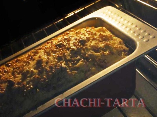 Engrasa el molde donde vas a hornear, te recomiendo lo uses de aluminio más que de silicona puesto que de esta forma se hornea mejor, el que yo he usado es para plumcakes. Coloca en el molde la masa y tapa con una hoja de papel film untada en aceite, deja que repose durante 1 hora en un sitio cálido y sin corrientes de aire (el horno apagado suele ser buen sitio) para que termine de fermentar, verás como ha crecido transcurrido el tiempo.