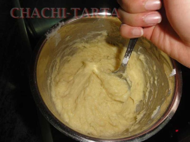 Con ayuda de una cuchara de madera remueve vigorosamente hasta que se note la masa sin grumos, añade el primer huevo y remueve hasta incorporar añade el segundo huevo y termina de mezclar.