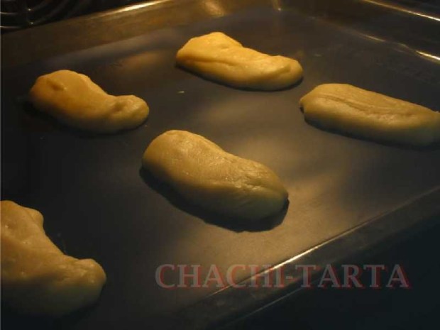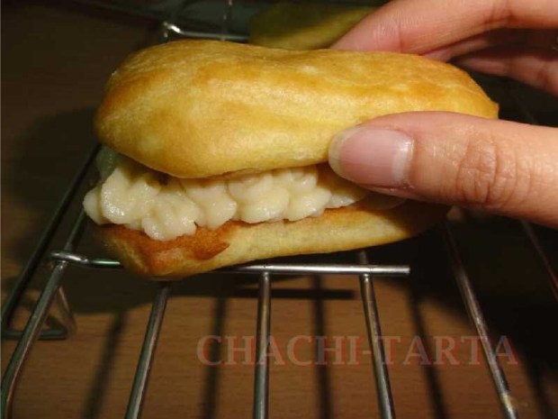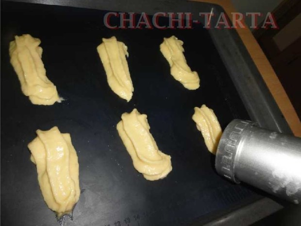 La idea era que cogiesen más aire y que quedaran un poco más inflados y así poder rellenarlos con la crema. Probablemente no haya mezclado la masa lo suficiente, en fin, como me han quedado un poco bajitos he usado 2 para formar cada relámpago.