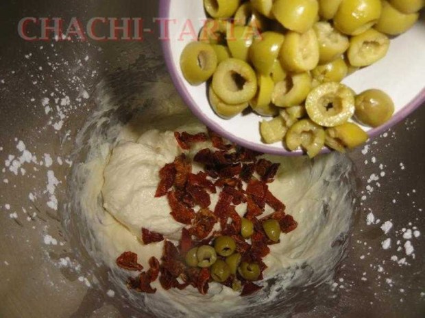Puedes amasar a mano o ayudarte de un robot amasador, lo importante es amasar lo suficiente como para obtener una masa homogénea y sin grumos. Corta el tomate y las aceitunas en trocitos pequeños e incorpóralo a la masa, continúa amasando ligeramente para distribuir bien.