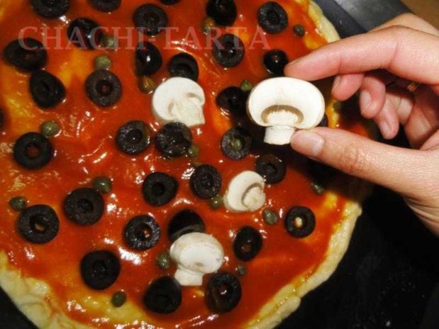 Salpica un poco la superficie con aceite de oliva y coloca el resto de ingredientes: el tomate frito, los champiñones, aceitunas, alcaparras, los filetes de anchoas y finalmente espolvorea orégano seco.