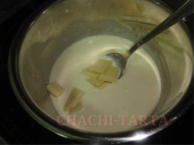 Anticipate a preparar el ganaché de chocolate blanco al menos unas 8 horas previas ya que éste tiene que enfriar mucho antes de usarse. Para ello pon a calentar la nata líquida junto con el chocolate blanco hasta que éste se disuelva, no hace falta que rompa hervor; cuando eso retira del fuego, deja templar unos 20 minutos a temperatura ambiente y conserva en la nevera hasta su posterior uso.