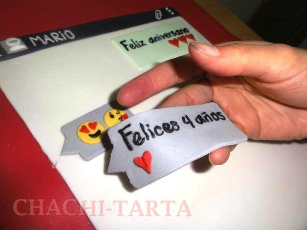 Para esta tarta, aunque se vea sencilla tengo que decir que me llevó unas cuantas horas hacer tantos detalles para que pareciese un móvil de verdad (he tomado de modelo mi antiguo móvil por cierto), ya que los mensajes, los emoticonos y todo está hecho a mano. Empecé por hacer la pantalla, la que dejé reposar unas 24 horas para dar lugar a que endureciera un poco y no se deformara una vez puesta sobre el bizcocho.