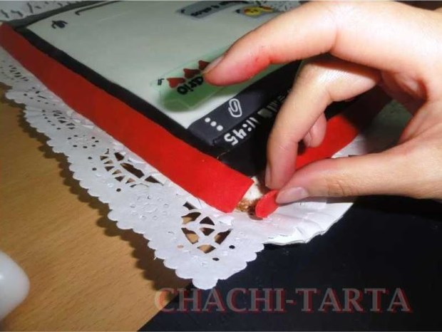 Posteriormente recorté tiras de fondant que distribuí de modo tal que cubriera toda la superficie, quizá hubiese sido más fácil recubrir toda la tarta en una sola pieza y luego colocar la pantalla pero no quería sobrecargar con varias capas de fondant todo el bizcocho que ya por si es bastante dulce.