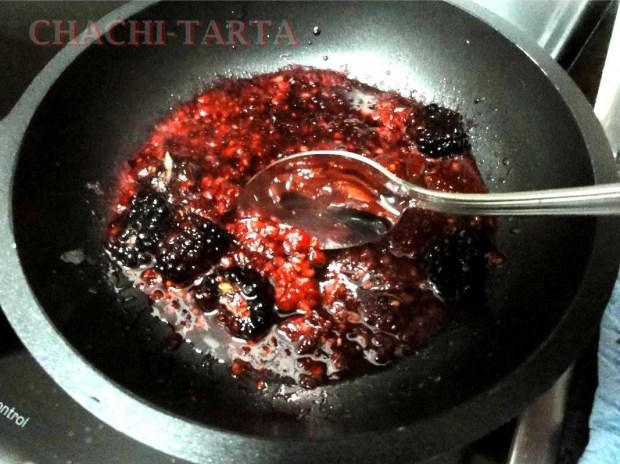 Para intensificar el sabor de las tartaletas he preparado un coulis de frutos rojos, para ello solo hace falta cocinar los frutos rojos con mantequilla y azúcar, remover cada poco hasta que suelten todos sus jugos y se disuelvan. Para que quede mas fino una vez cocinado te recomiendo pasar por el colador.