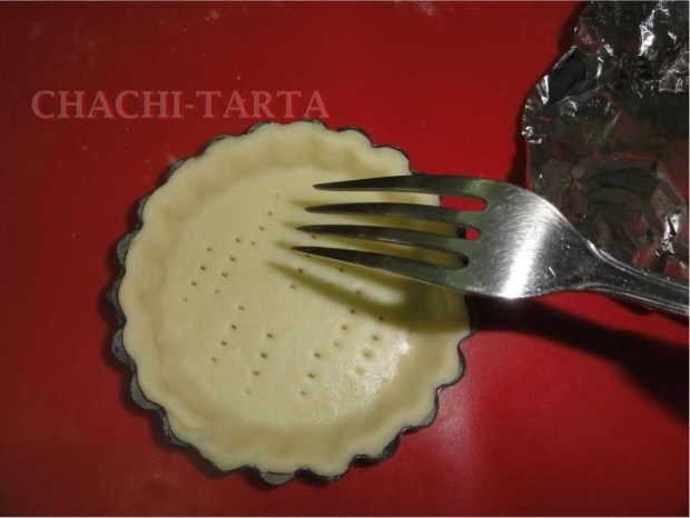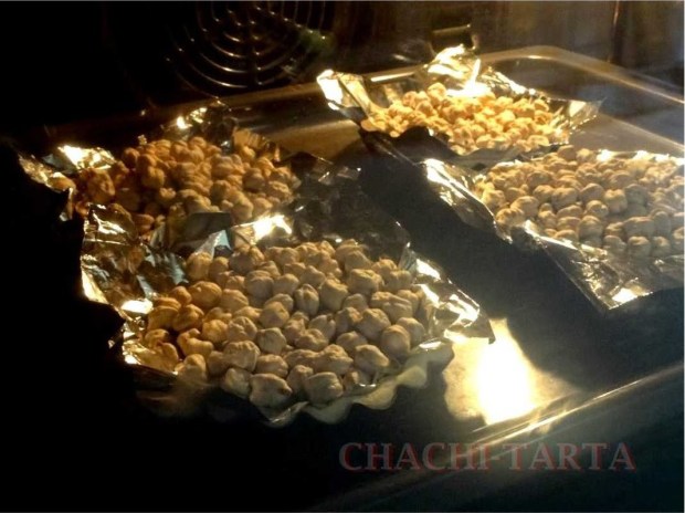 Coloca una hoja de papel plata o papel vegetal por encima de cada tartaleta, ponles peso por encima (yo uso garbanzos en crudo) y hornea a 200 grados durante 15 a 20 minutos. Lo de los garbanzos es para que no se deforme durante el horneado.