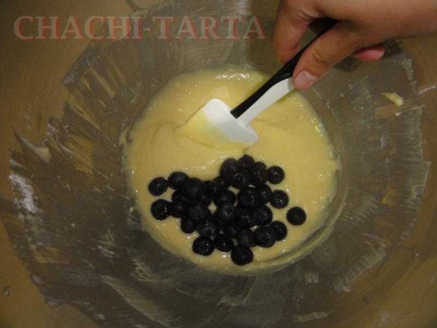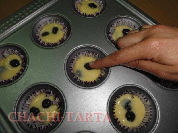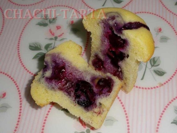 La cosa mejora si además añadimos unos cuantos frutos rojos, en este caso he utilizado arándanos, la combinación ideal para preparar estos tiernos pastelillos que en casa han gustado mucho.