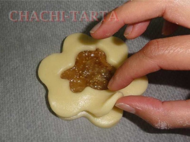 Coloca mermelada de higos en el centro de la galleta y pon por encima la galleta ahuecada para que quede visible, coloca las galletas en la bandeja del horno.