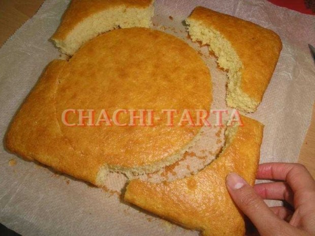 Para hacer la tarta en forma de taza, he tenido que hornear 4 bizcochos, 2 de ellos son de chocolate y los otros 2 de almendra que he apilado alternando los sabores. Para que la tarta tuviese las proporciones adecuadas he recortado cada bizcocho en forma circular con 20 cm de diámetro.