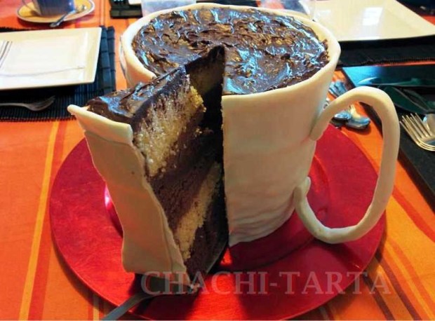 Quizá la mayor complicación de esta tarta es hacer que realmente parezca una taza y sin la oreja no sería como tal. Así que para hacerla tuve que anticiparme unos cuantos días para dejar que endureciera, además tenía que ser liviana para que al pegarla se sujetara sin problema con lo cual la hice hueca; si quieres ver más detalles puedes mirar el videotutorial al final de esta publicación.