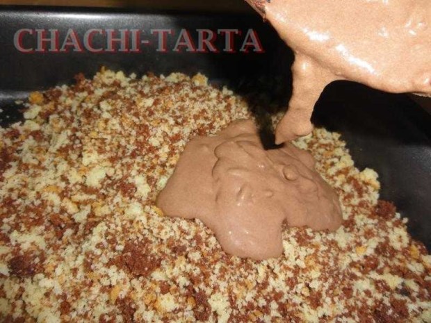 Desmiga los sobrantes de bizcocho (en mi caso sin gluten, de chocolate y almendra) e incorpora la nata montada, que para el caso le he añadido un poco de cacao.