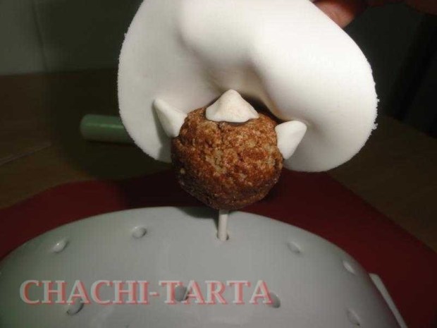 Extiende el fondant blanco (marca KELMY – sin gluten) y recorta piezas circulares grandes de modo que puedas cubrir el cake-pol por completo. Coloca trocitos de fondant simulando los brazos, un trocito por arriba en la cabeza y luego recubre con el fondant.