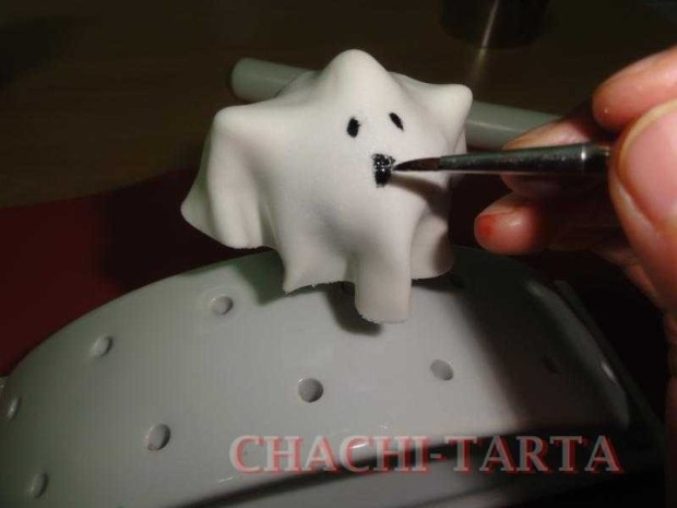Ajusta la parte de abajo de modo tal que quede con un poco de caída para que de la sensación de movimiento, finalmente pinta los ojos y boca con ayuda de un pincel fino utilizando colorantes comestibles (los de las marcas Sugarflair y Americolor vienen etiquetados como sin gluten).